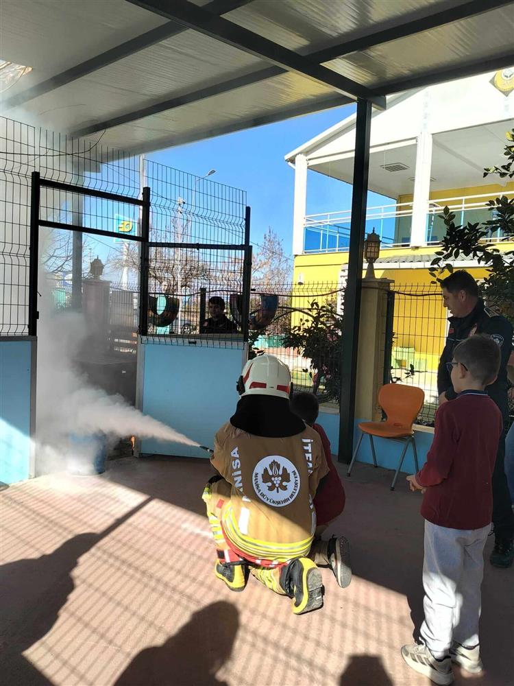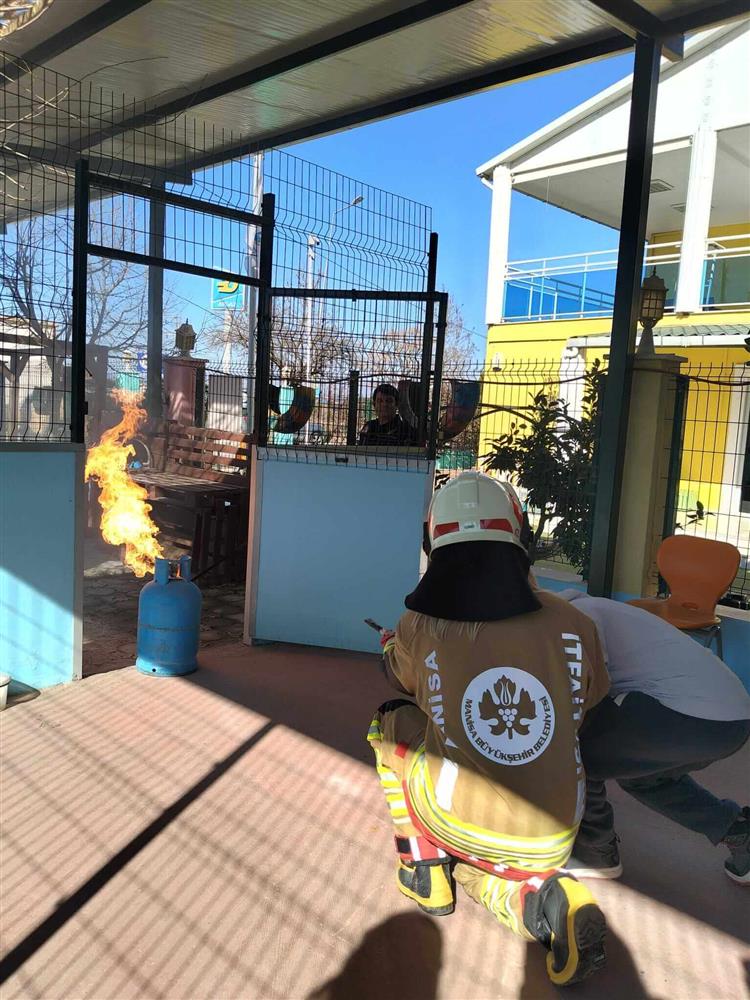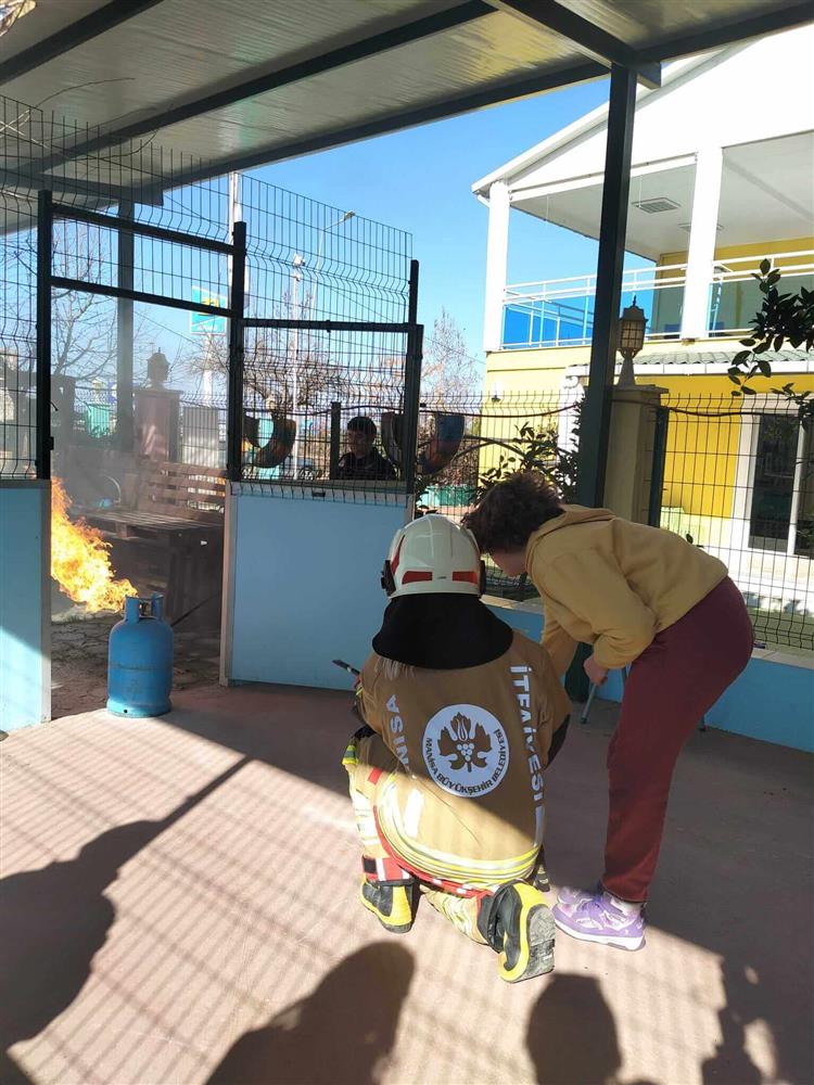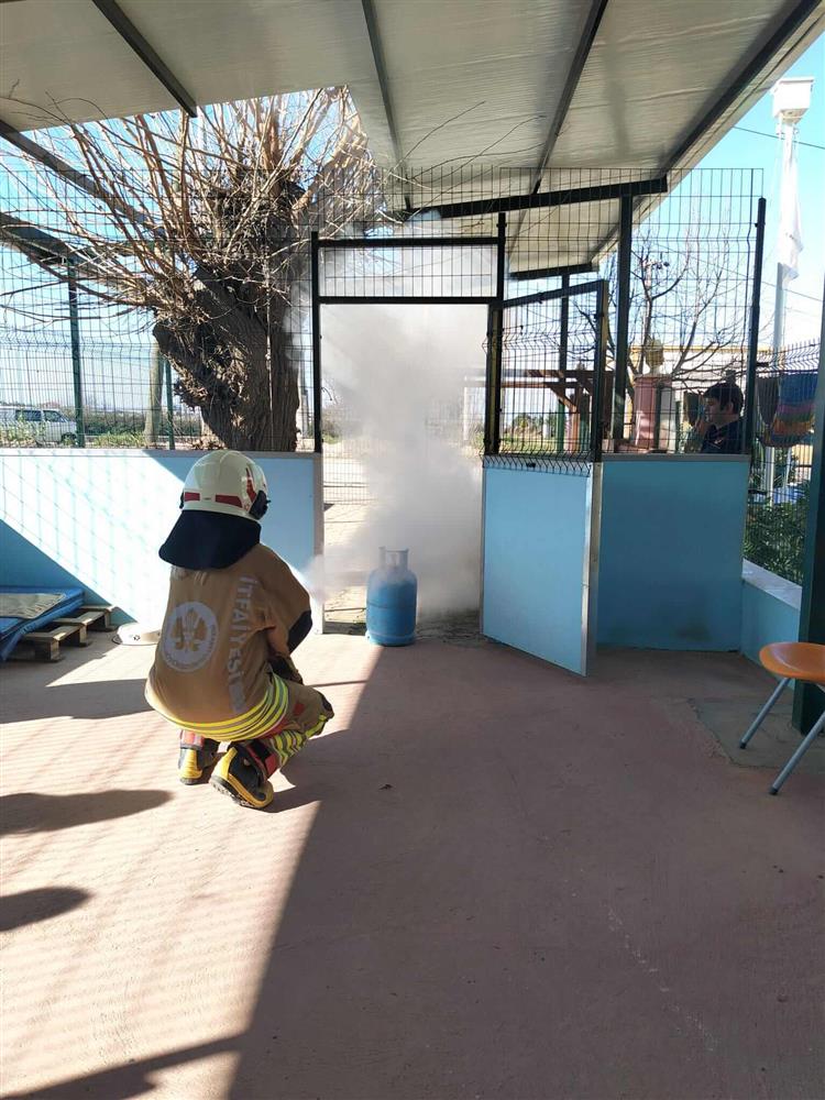 İtfaiye görevlileri tarafından kontrollü şekilde oluşturulan örnek bir ateş, yangın söndürme tüpü kullanılarak söndürüldü ve böylece yangın tüplerinin doğru kullanımı uygulamalı olarak gösterildi.